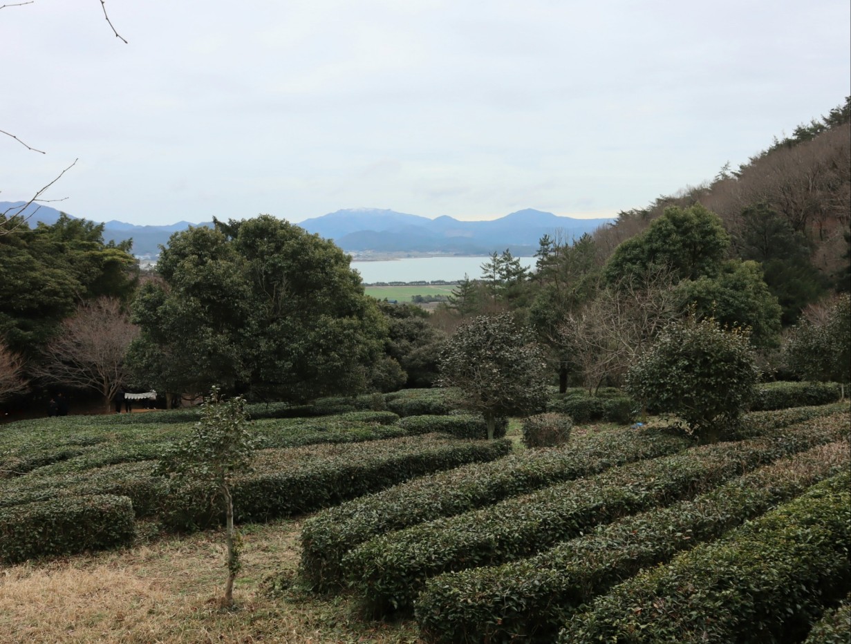 녹차밭 넘어로 강진만...